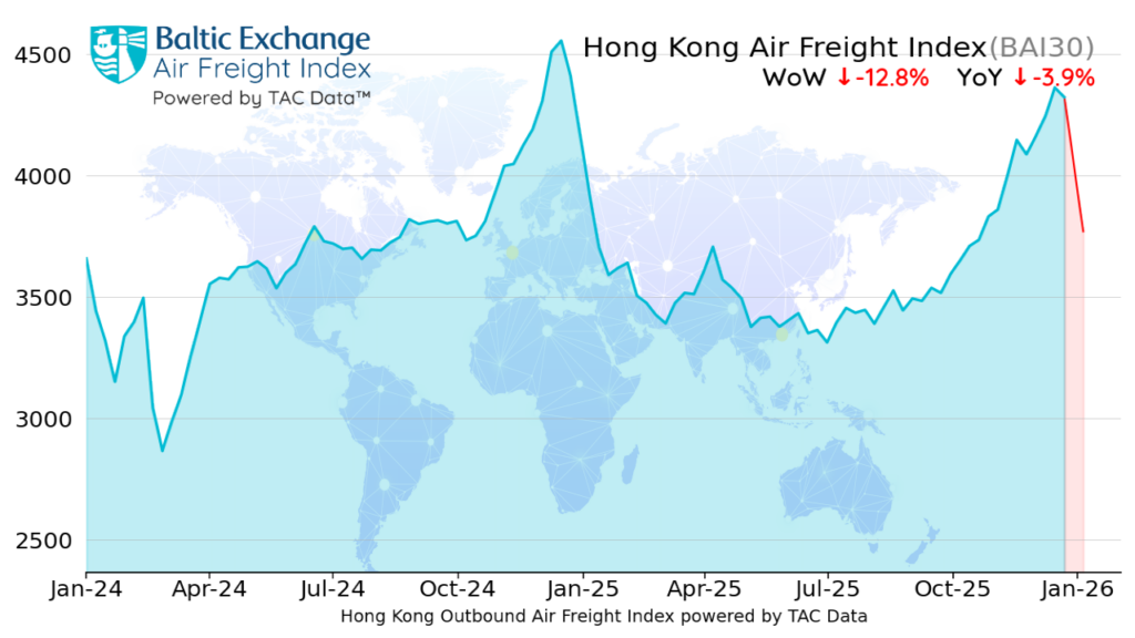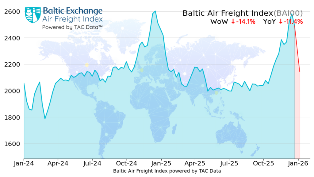 The global Baltic Air Freight Index (BAI00) calculated by TAC Data continued rising steadily through the first half of December before falling steeply in the final week after Christmas – ending the four weeks to January 5 lower by -15.0%.
