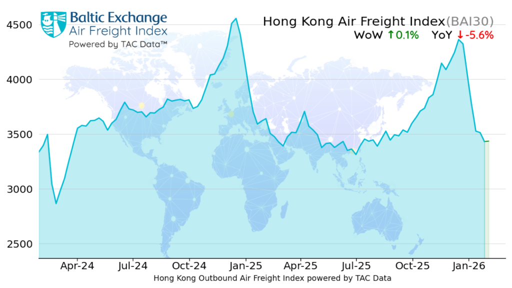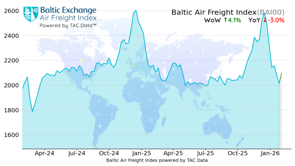Global air freight rates fell quite steeply for most of January – with the global Baltic Air Freight Index (BAI00) calculated by TAC Data dipping some -19.3% over the four weeks to January 26, leaving it lower by -6.1% over 12 months.