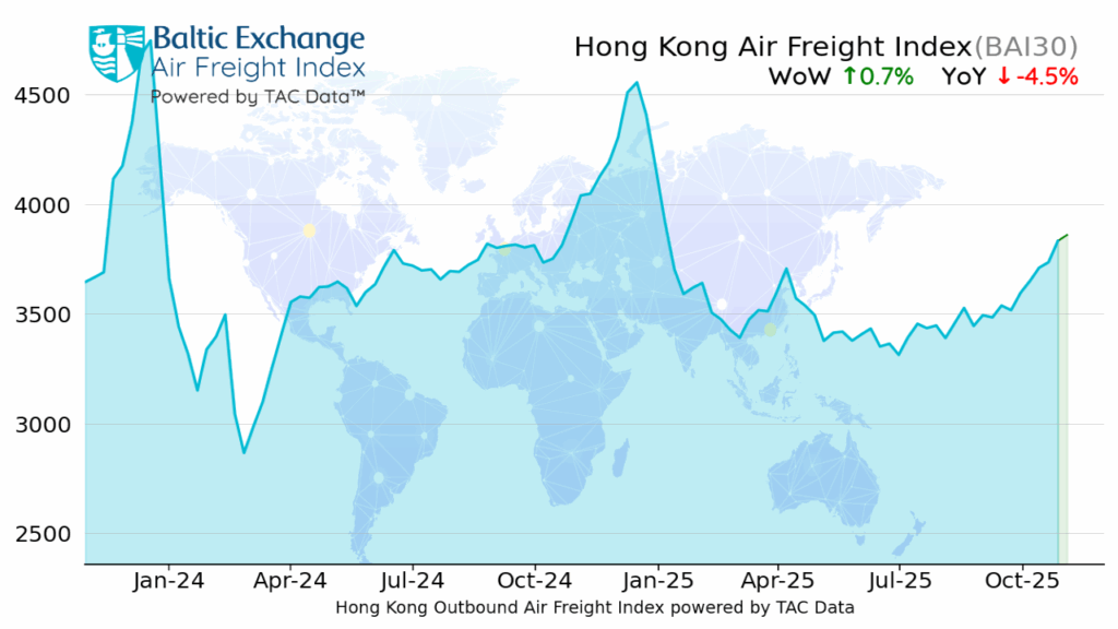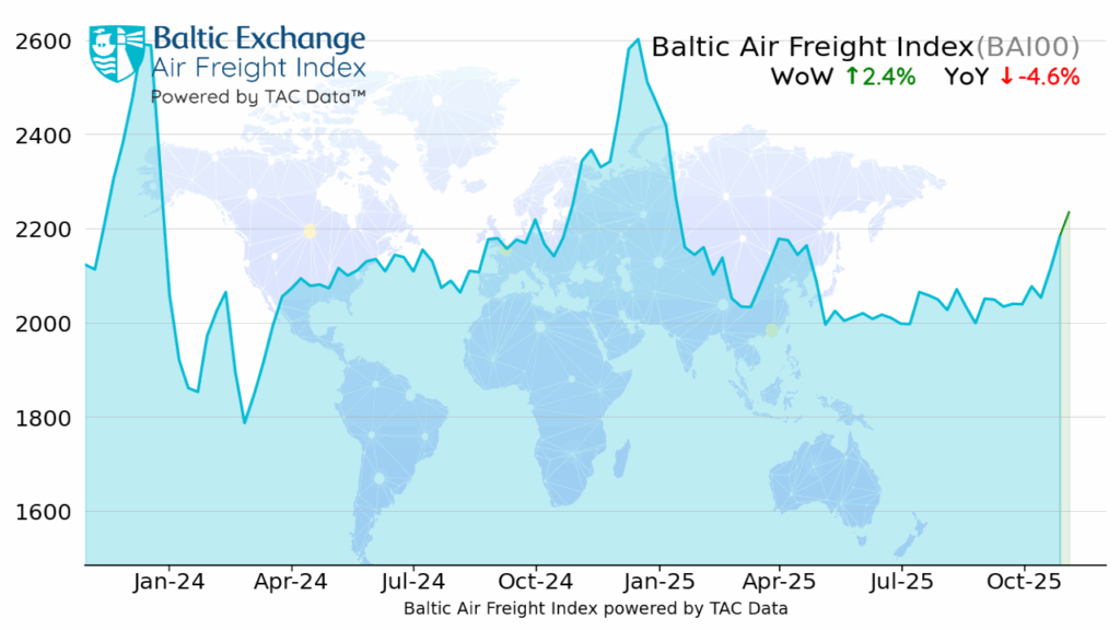 Global air freight rates rose strongly in October according to the latest data from TAC Index. The Baltic Air Freight Index (BAI00) gained a solid +7.6% over four weeks to November 3, leaving it not far below where it was 12 months earlier at -4.6% year-on-year.