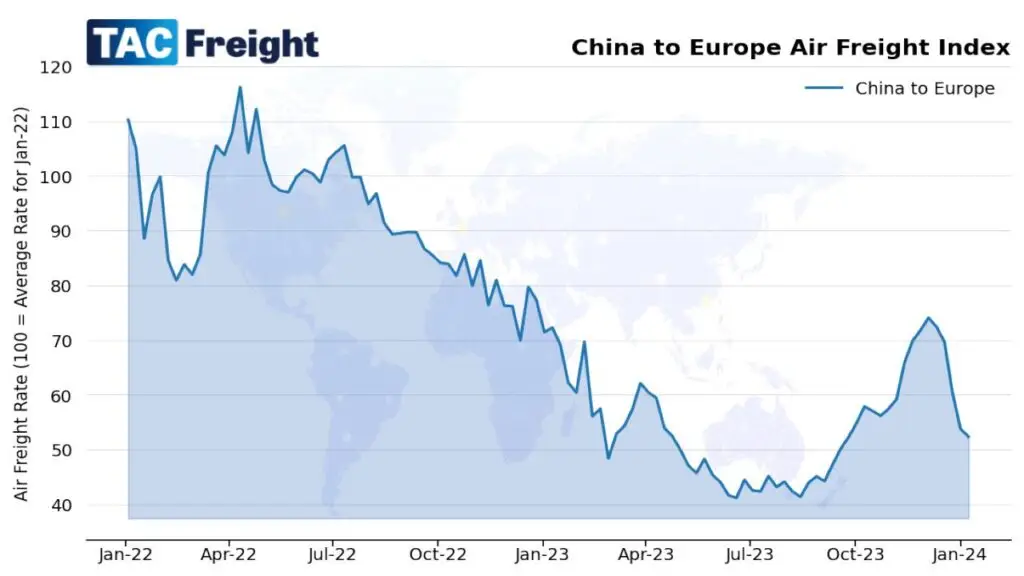 New geopolitical events in the Middle East, with the ongoing Red Sea crisis, means ocean freight is now being diverted around Africa. This increases both the cost and transit times for ocean shipments. With the reduction in air cargo prices in the new year the cost differential between ocean and air freight has narrowed, making air freight a more attractive option in the run-up to the Lunar New Year in February. Freight Forwarders are also getting an increase in enquiries for multi-modal sea air solutions via Dubai, Singapore, and Los Angeles. This could provide a good compromise between the speed of air freight and the cost of sea freight.