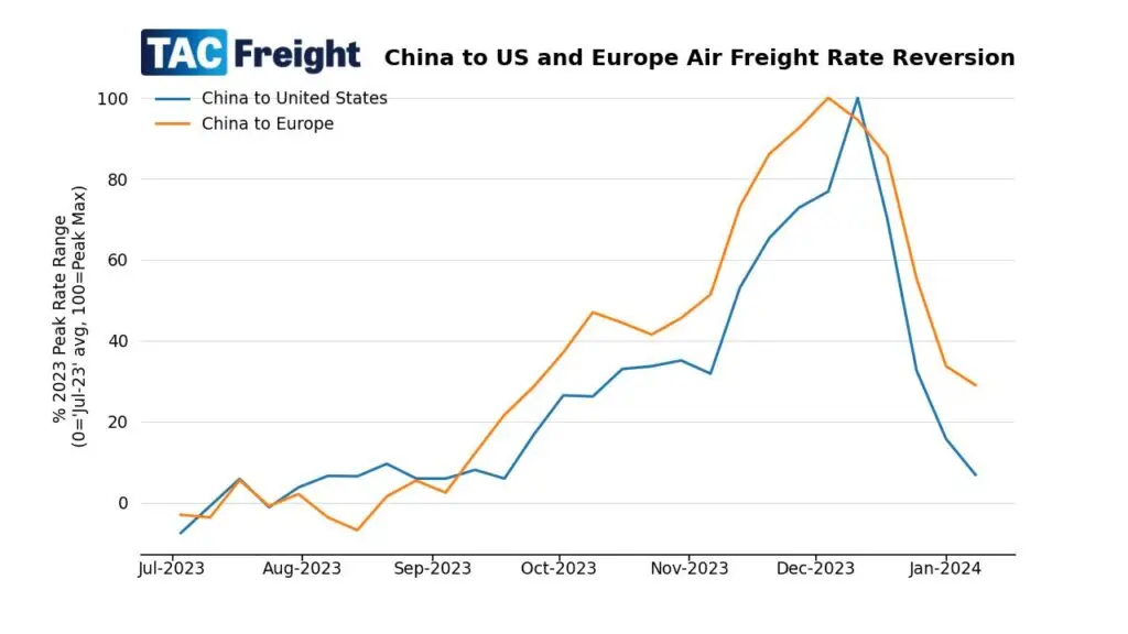 Air Freight Rates from China and Hong Kong to United States and Europe Revert from December Peak