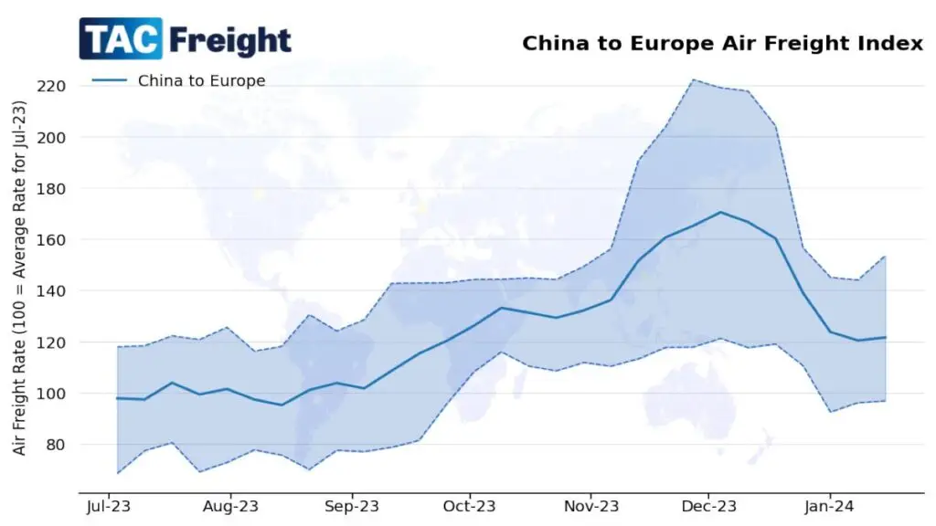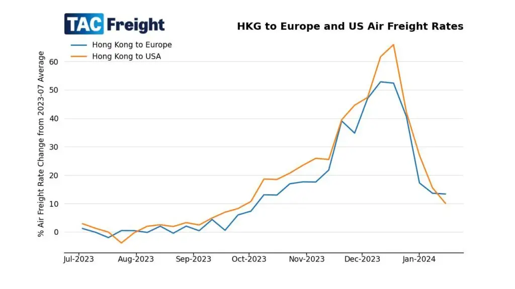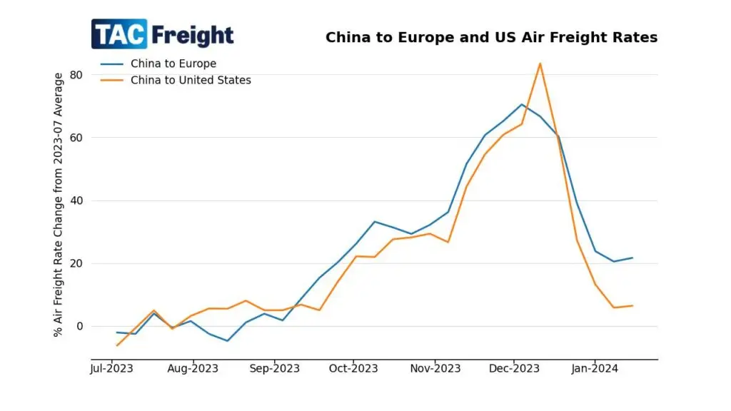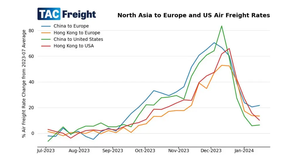 Data released by TAC Index on Monday 15th January showed that air cargo prices from North Asia to Europe had increased, but we have yet to see a ‘surge’ in rates from the current ocean freight disruptions.