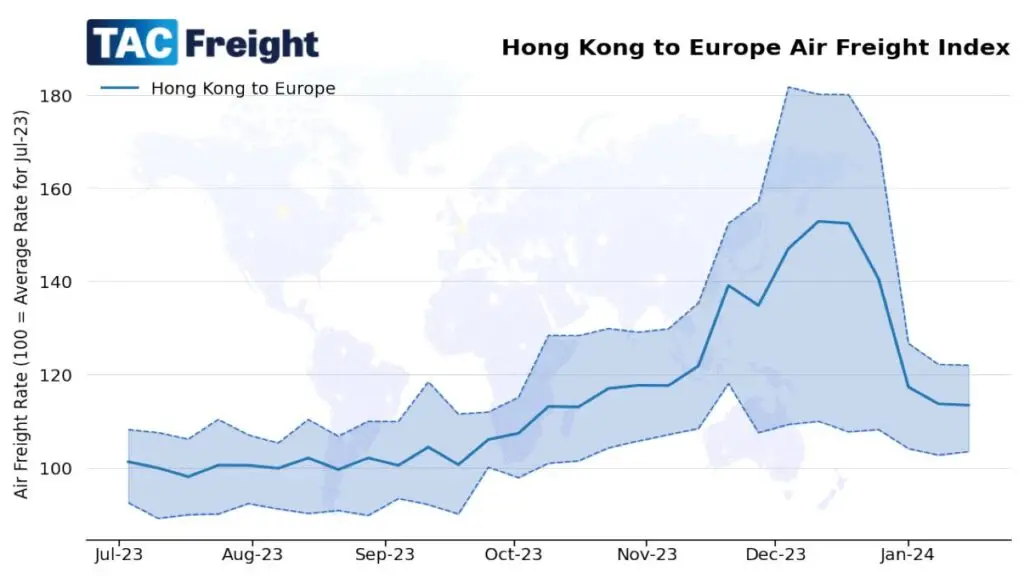 Higher air freight rates from North Asia to Europe compared to the US, relative to pre-peak levels (average rate in July 2023), supported by the underlying price distribution dynamics, suggest higher and increasing air cargo demand, especially out of China. This is likely in reaction to the ocean freight disruptions combined with the upcoming Lunar New Year holidays when demand and rates tend to rise.